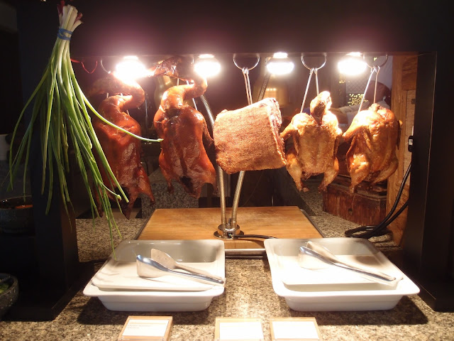 餐厅属于长形格局,空间有限,自助餐台分别摆在餐厅两端。一进门就看到主餐台,四方形的餐台四边摆满食物,师傅可以站在中间。甜品区在大门的左边。走到餐厅最尾端,还有成排的热菜。